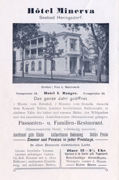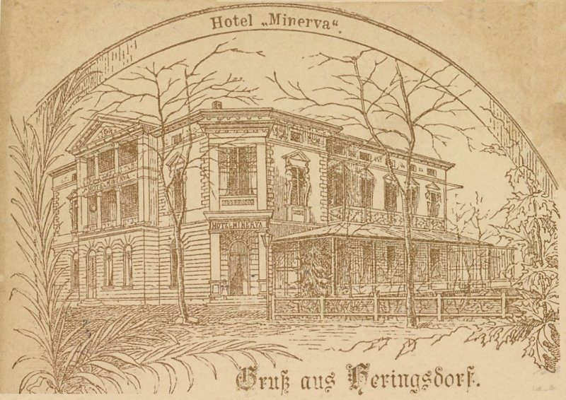 Das Hotel wurde um 1900 als Hotel Minerva im klassizistischen Stil erbaut. In einer Anzeige in einem Heringsdorf Führer aus dem Jahre 1908 war Frau L. Muscheweih die Besitzerin des Hauses.