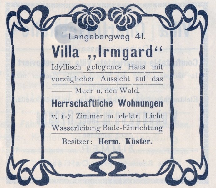 Im Jahre 1908 war Herm. Köster Besitzer der Villa Irmgard. Der Schriftsteller Maxim Gorki weilte im Jahre 1922 zu einem Kuraufenthalt in Heringsdorf in der Villa Irmgard. Durch das gesunde Klima in dem Seebad erhoffte er Heilung von seiner erneut ausgebrochenen Tuberkuloseerkrankung. Da ein Schriftsteller ohne Arbeit nicht leben kann, diente ihm die Villa nicht nur als Wohnung, sondern auch als Arbeitsstätte. Der im Gästebuch der Villa verewigte Satz „Und dennoch und trotz alledem werden die Menschen eines Tages wie Brüder leben“ gibt uns auch heute Hoffnung und hat nichts von seiner Aktualität verloren.
