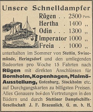 Im Jahre 1896 bringt J. F. Braeunlich das Schiff in die neu gegründete „Stettiner Dampfschiffs-Gesellschaft J. F. Braeunlich GmbH“ Stettin, ein.Der Saisonschnelldampfer Freia der war eines der bekanntesten Schiffe der Braeunlich Reederei Stettin. Das unverwechselbare Wahrzeichen des Schiffes war der schräge Schornstein.