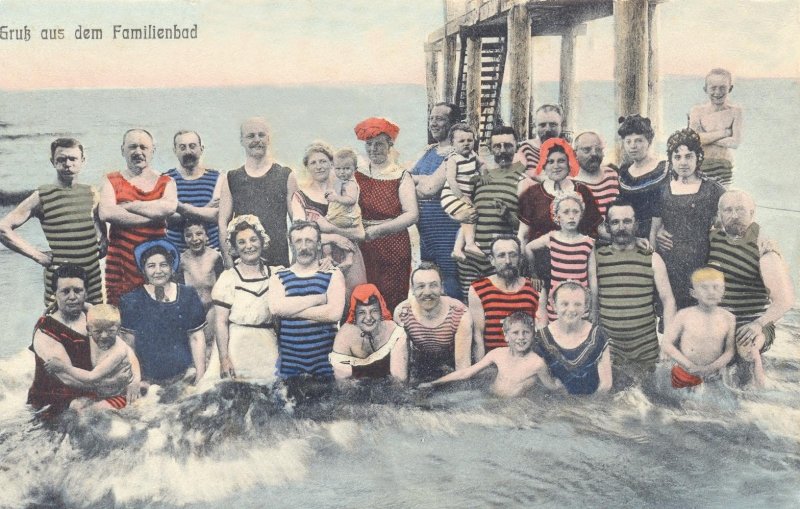 Wie in Swinemünde wurden alle Familienbäder hufeisenförmig ins Meer gebaut, um fremden Personen den Einblick zu erschweren. „Aber es dauerte nicht lange, da lockerten sich auch die strengen Sitten in den Familienbädern und die neuen Badekostüme aus dünner Baumwolle konnten ihre erotischen Reize entfalten“, fuhr Tante Trude fort. „Der quer gestreifte Schwimmanzug wurde schon um 1860 in England erfunden und setzte sich von dort mit erheblicher Verzögerung auch auf dem Kontinent durch.