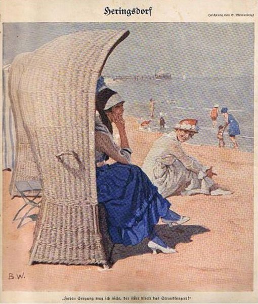 "Ich merke, Ihr Kinder werdet langsam ungeduldig, deshalb nur noch ein paar Worte über den Strandkorb: 1882 fertigte der Rostocker Korbmacher Wilhelm Bartelmann eine passende Sitzgelegenheit für eine ältere rheumakranke Dame. Dieser Strandkorb, zuerst ein familienunfreundlicher Einsitzer, später Zweisitzer erfuhr um 1910 noch eine technische Weiterentwicklung als zweiteiliger Liegekorb.